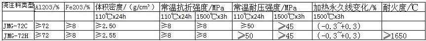 2.2 熱軋高溫加熱爐用鎂鉻質(zhì)耐火澆注料標準 熱軋高溫加熱爐用鎂鉻質(zhì)耐火澆注料牌號分為 JMG-72C 、JMG-72H。其中J為澆注料第1個字的漢語拼音首字母,M、G為鎂鉻的漢語拼音首字母:JMG后面的數(shù)字表示產(chǎn)品的MgO含量。數(shù)字后面字母H表示有特定要求的材質(zhì),C表示普通材質(zhì)要求。熱軋高溫加熱爐用鎂鉻質(zhì)耐火澆注料的性能應(yīng)符合表7 表7軋鋼加熱爐用鎂鉻耐火澆注料性能指標